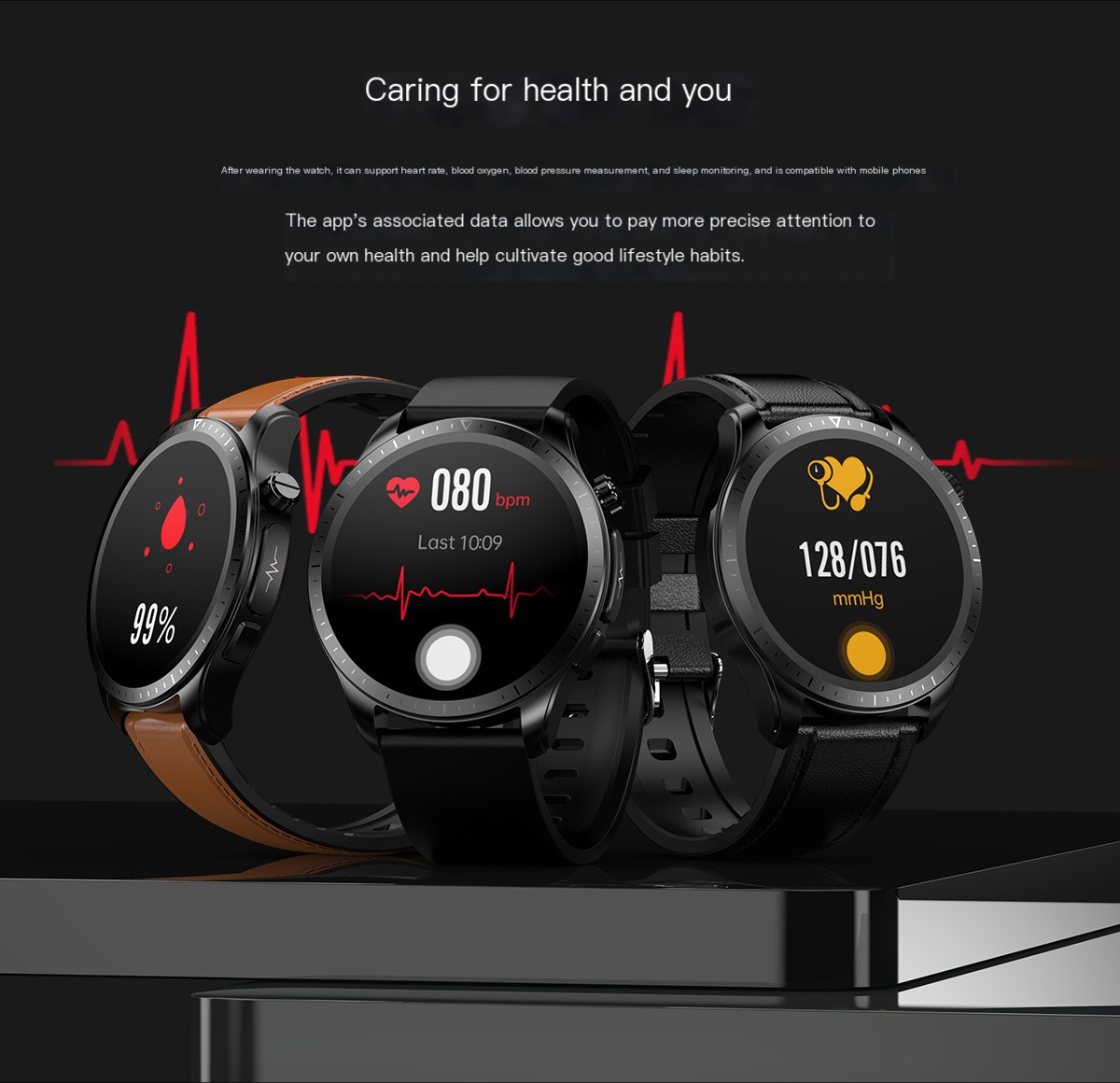 The watch features multiple choices to pick from, from casual colors of black, pink, and blue, to sleek, formal options such as black and brown leather to a black steel design. All of which Includes features such as photo taking, step counting, heart rate monitoring, and Bluetooth calls, within its smart touch screen interface.